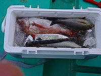 奈良の川添さんが寿司のねたにサバをクーラー満杯、チダイ25〜40cm5匹 レンコダイ25〜35cm5匹 チカメ30cm1匹 イサキ30〜33cm2匹 サバ35〜42cm30匹 マハタ40cm1匹 マアジ30〜33cm5匹 シロムツ20〜25cm10匹 8目釣り。
