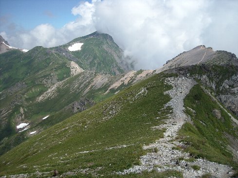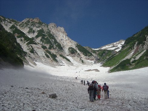 大雪渓を下山。ガスの中だったが、たまにガスが切れることもある。