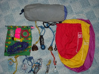 ![]() 小物。大体これをいつもザックに入れていく。 鈴、コンパス、テープ、ナイフ、雨具、紐。 |