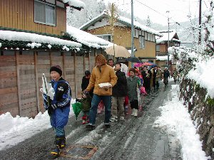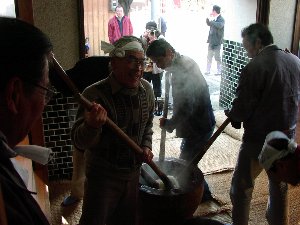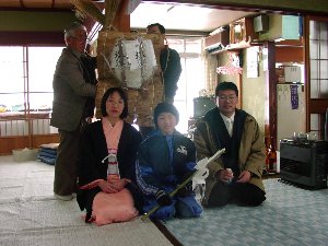 | 我が家は後頭であるが、後ろのおとうさん(大能・も ち)をこれから奉納するところ。もちは3臼分・6升を 丸い輪に収めて神社に奉納する。 |