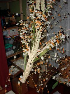 | 三叉の木に餅をつけた「はなもち」 | にんじん、黒豆、大根をつけた「むかご」 |